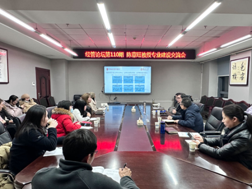 陈章旺教授以“新文科背景下经管类专业建设的思考”为题,从专业特色、培养目标、培养体系、专业建设思路、专业改革路径等方面详细介绍了福州大学国家级一流专业建设点(市场营销专业)的建设经验。会上我院教师就一流课程建设、专业办学特色、产教融合、双创融合等内容与陈教授进行了深度交流。