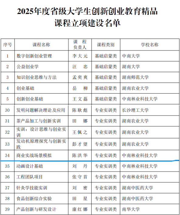 近日,湖南省教育厅正式公布了《2025年度省级大学生创新创业教育精品课程立项建设名单》,我院陈洪华老师主持的《商业实战场景模拟》专业实训课程获批立项建设!