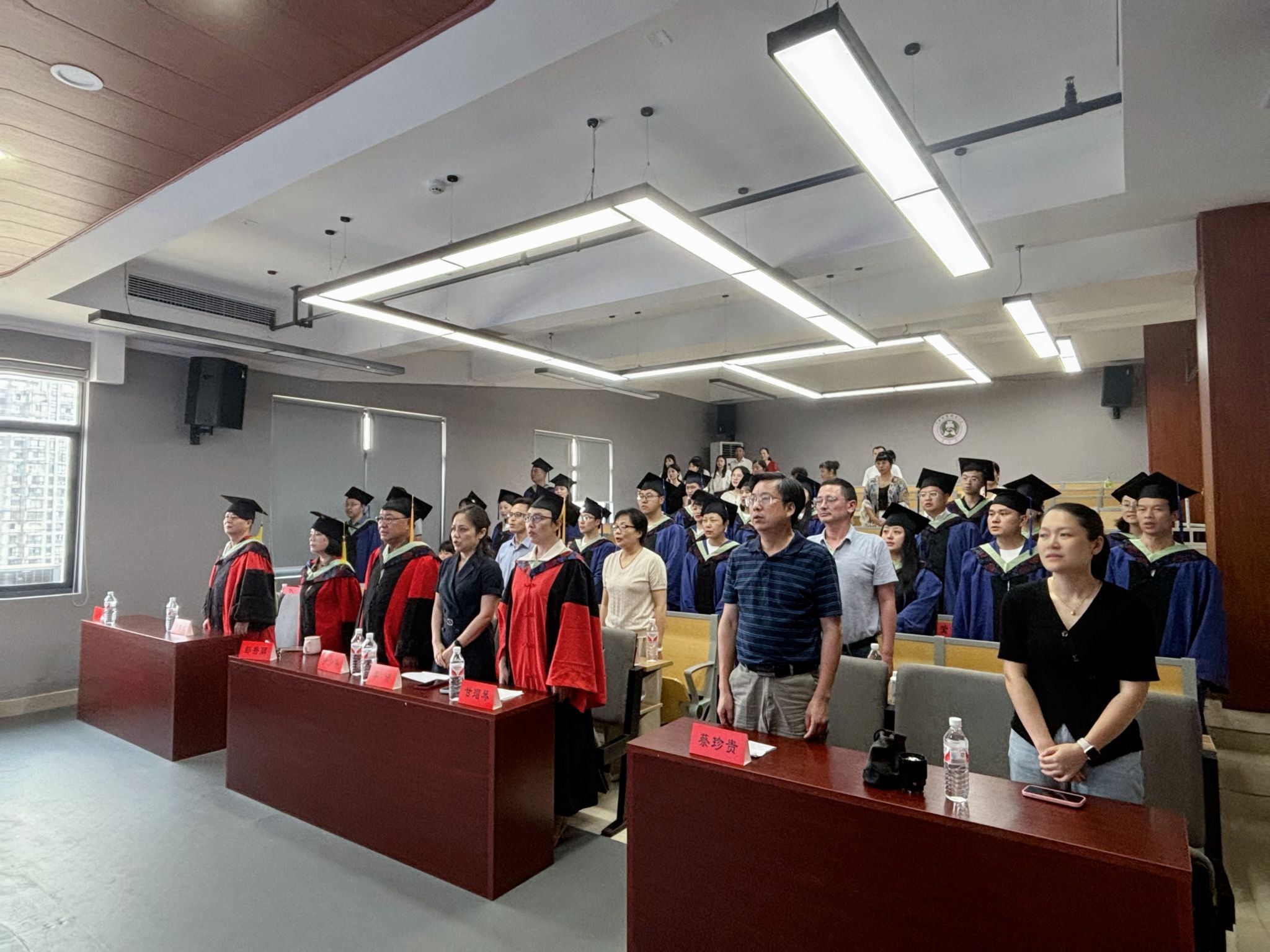 副院长甘瑁琴在宣读授予学位决定及名单后,与尹少华教授、彭秀丽教授、罗攀柱教授一同为毕业生拨穗正冠并颁发证书。