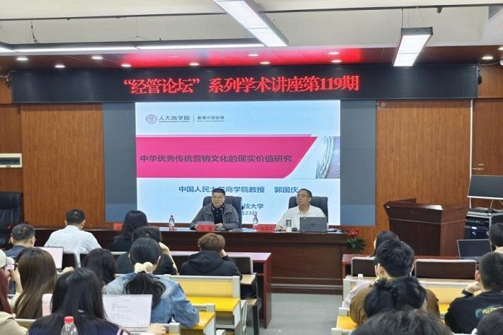 2025年4月23日上午,我院举办的“经管论坛”系列学术讲座第119期暨教育部市场营销课程教学虚拟教研室名家讲坛“中华优秀传统营销文化的现实价值研究”在博文楼南1205成功举办。本期讲座嘉宾是中国人民大学二级教授、博士生导师、享受国务院政府特殊津贴专家、首届国家级课程思政教学名师郭国庆教授,讲座由经济管理学院党委书记方威教授主持,100多名师生参加学习。