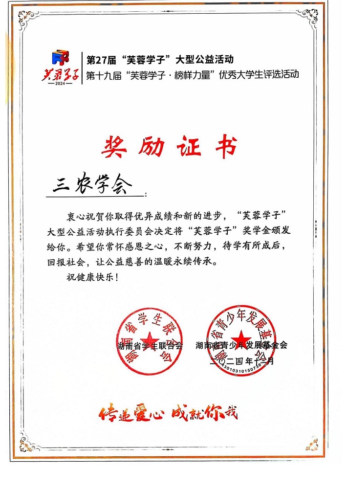 12月26日晚,由共青团中南林业科技大学委员会主办的第十九届“芙蓉学子·榜样力量”优秀大学生颁奖典礼暨宣讲会于博文楼立德厅成功举行,我院王金龙老师指导的“三农学会”学生社团喜获“公益行动”奖。
