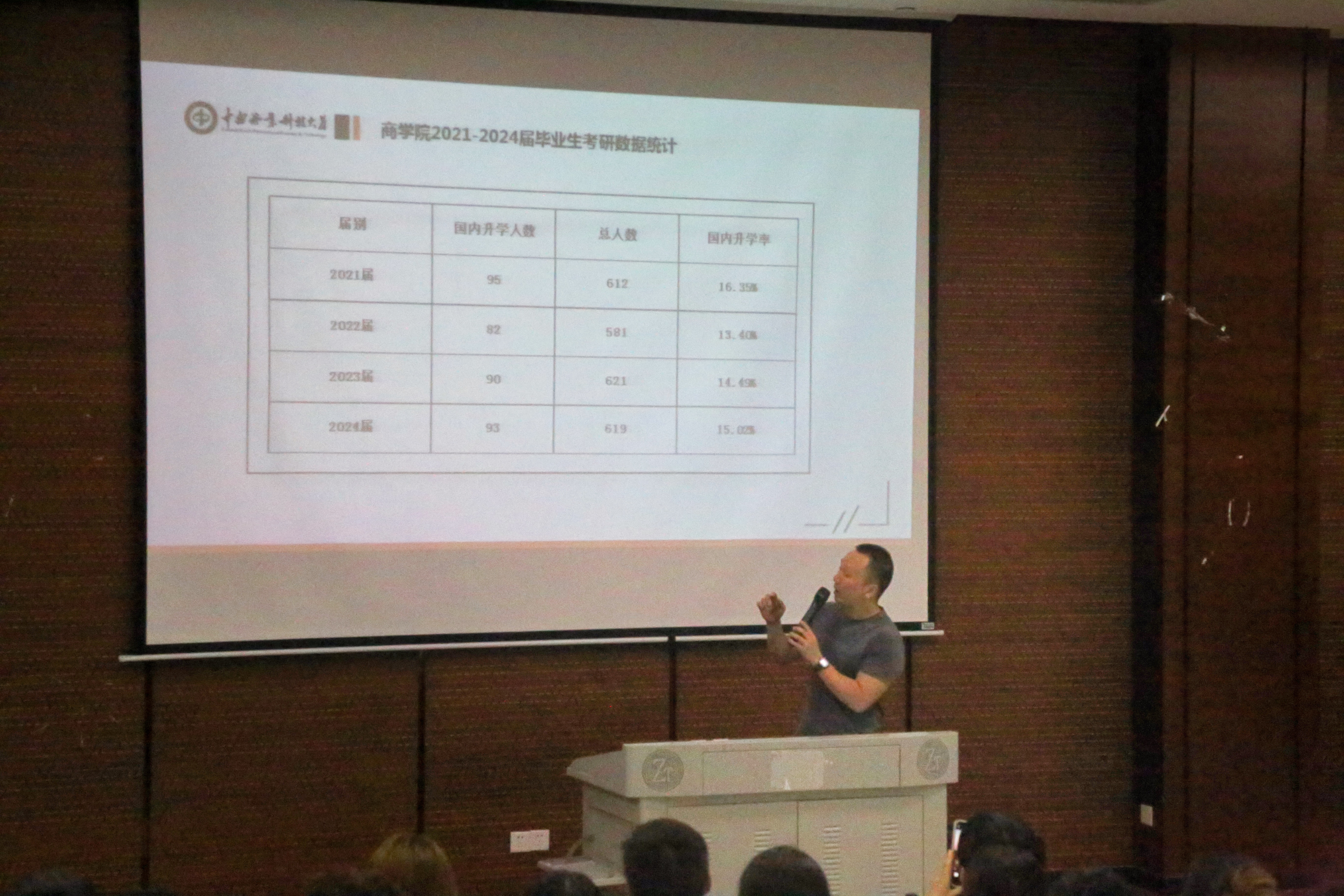 会议第二项,商学院就业专干马龙老师从考研,考公,就业三个方面分析当前就业形势。通过对比往年学生升学率、考公比率、上岸率等数据,建议同学们要理性选择考研院校和考公地域,积极服从调剂,做到能报尽报。对于就业,马龙老师向同学们介绍线上线下的不同招聘渠道,建议同学们:避免“玻璃心”,注重复盘。并且,向同学们分享考研经验,要善于寻找优质学习资源,传授备考攻略。最后,何佩云老师对会议进行总结,告诉同学们在未来学习生涯中,要严谨认真,踏实勤奋,坚定理想,付诸行动。