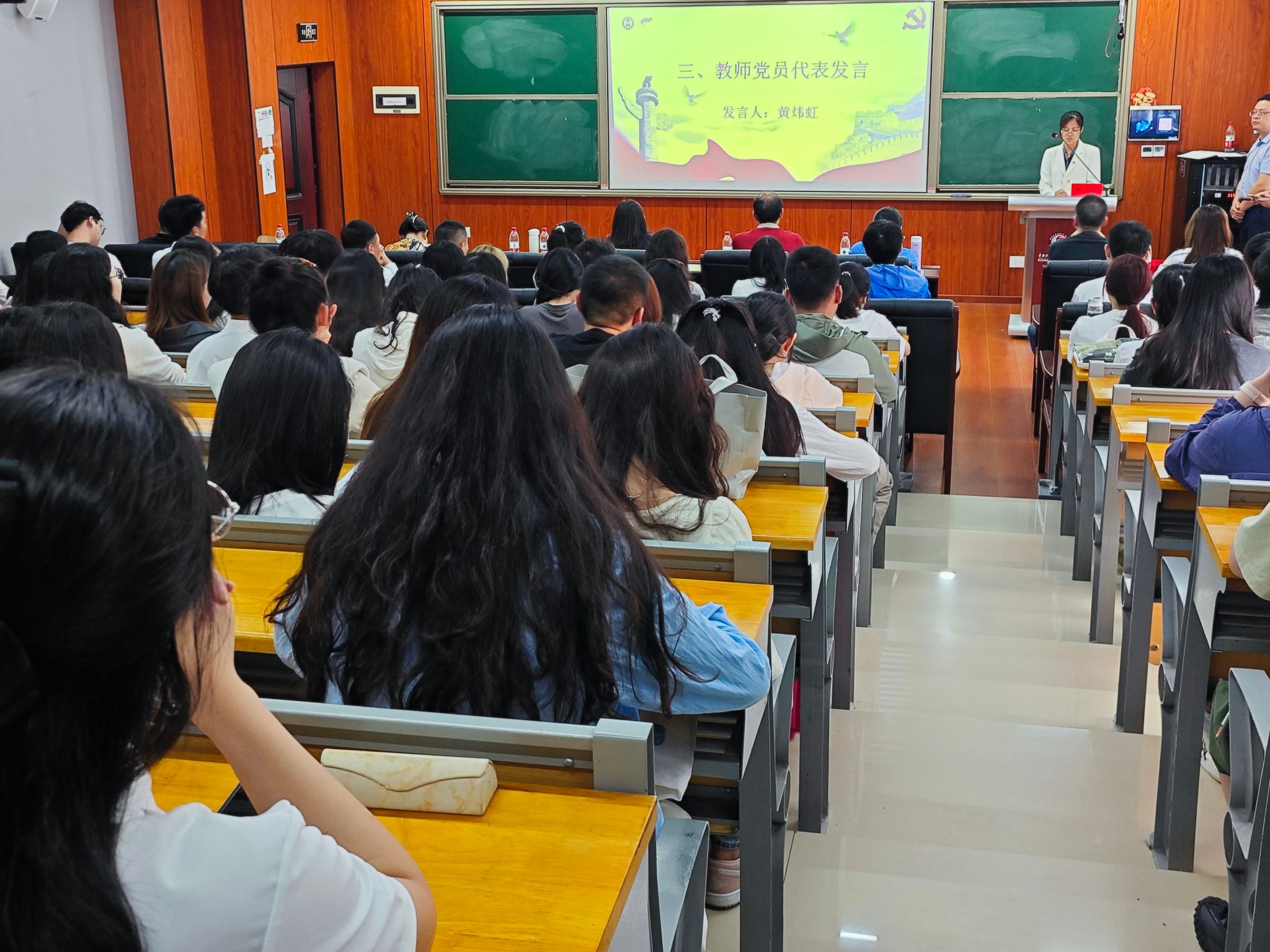 黄炜虹作为教师党员代表发言,她向在座毕业生党员提出以对党忠诚、实干担当和严格自律翻过“信念动摇”之山、“躺平摆烂”之山、“贪欲腐化”之山的三点期许,希望毕业生党员们能够时刻牢记初心和使命,坚定信心、笃定前行。