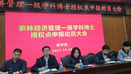 博士点建设是高质量、高水平学科建设的核心,是衡量一所大学办学水平的重要标志。10月24日在博文楼南1205商学院学术报告厅,学院组织召开农林经济管理学科建设推进暨新一轮博士点申报动员会。副校长仇怡、研究生院院长李贤军、社科处处长侯茂章、社科处副处长刘灵犀以及全院全体教职员工110余人参加会议。会议由学院党委书记彭爽主持。