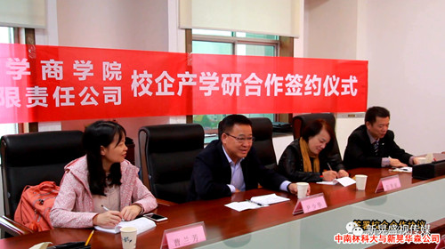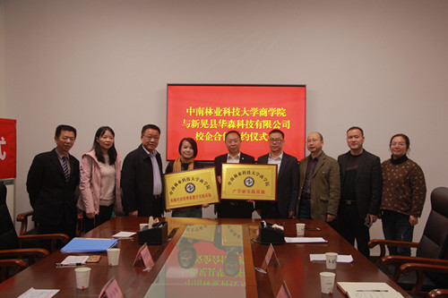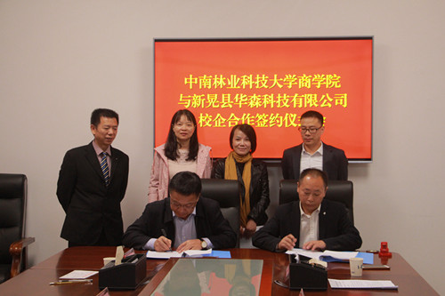 2019年10月25日,中南林业科技大学商学院与新晃华森科技有限责任公司校企合作协议签约仪式在新晃侗族自治县政府办公楼举行。中南林业科技大学商学院尹少华院长、彭秀丽教授、曹兰芳副教授、李龙博士,新晃侗族自治县政府办、商科工信局、农业农村局等相关领导参加了签约仪式。商学院院长尹少华代表学校授予新晃华森公司 “产学研实践基地”、“农林经济管理系教学实践基地” 牌匾。此次签约仪式被湖南日报的《新湖南》官方媒体和当地《新晃盛世文化传媒》等多家媒体报道。