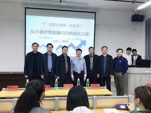 2019年10月29日晚7:00-9:00,商院大讲堂MPAcc专场在博文楼南1205学术报告厅举行。本次论坛主要面向我校MPAcc研究生和部分本科生。本次论坛的主讲嘉宾为我校优秀校友、现任职穗甬融信资产管理股份有限公司副总裁的周四明先生。主题报告分为两部分:第一部分为“从会计员到金融CEO的成长之路”,第二部分为“基于绿色健康金融环境建设的不良金融资产重组路径分析”。