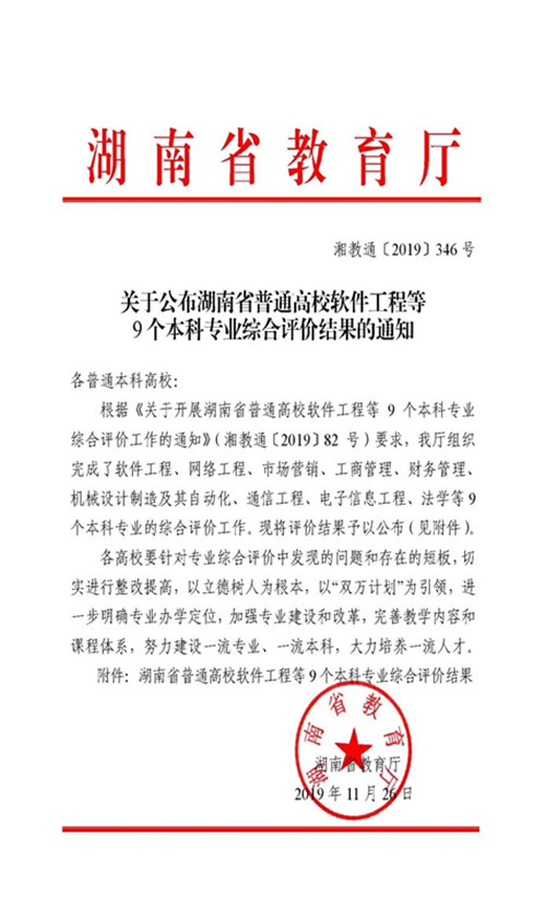 近日,湖南省教育厅公布了《关于公布湖南省普通高校软件工程等9个本科专业综合评价结果的通知》(湘教通[2019]346号),我院市场营销专业在2019年湖南省普通高校本科专业综合评价中喜获A级。