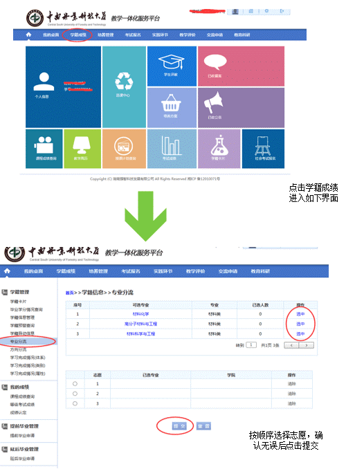 第十周周一(11月6日)上午11:00之前,学生在教务管理系统按顺序填报4个志愿,逾期填报系统将关闭,系统填报操作方法见附件《专业分流志愿填报流程》。