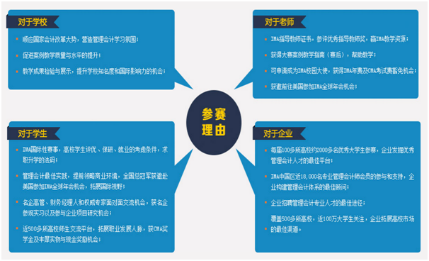 IMA校园管理会计案例大赛是美国管理会计师协会(IMA)组织的全球性校园公益活动,其所侧重的预算预测、内部控制、决策分析、风险管理等内容非常符合企业对会计人才的需求。目的是给在校大学生提供透视商业环境、理解商业思维、提升职业竞争力,并在步入职场前获得一次充分提升职业意识和商业知识的机会。该项大赛2009年向中国高校开放,吸引了近500所高校超过200万大学生关注,8000多名学生报名参赛,1000多位教师参与指导,200多位优秀选手被知名企业选拔录用。