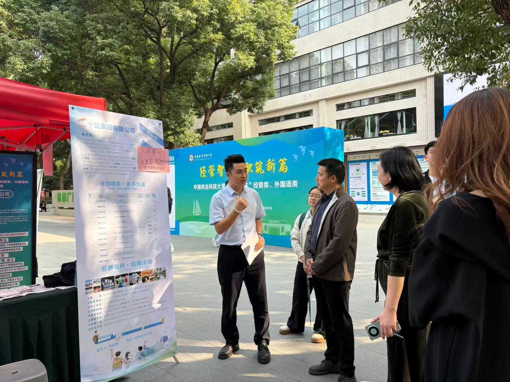 2025年10月28日下午“经管智航 职筑新篇”中南林业科技大学“金秋启航”经管类、外国语类毕业生校园双选会在我校林创广场举办。学院党委书记方威、副书记熊启明与用人单位代表、毕业生现场交流,详细了解企业招聘需求和毕业生求职意向,并鼓励毕业生确定合理的求职目标,把握与优质企业的双向选择机会,找到理想的工作岗位。