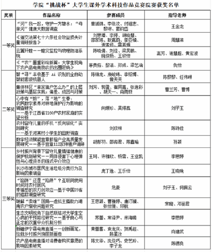 现将2025年"挑战杯"大学生课外学术科技作品竞赛学院院级选拔赛获奖名单公示如下: