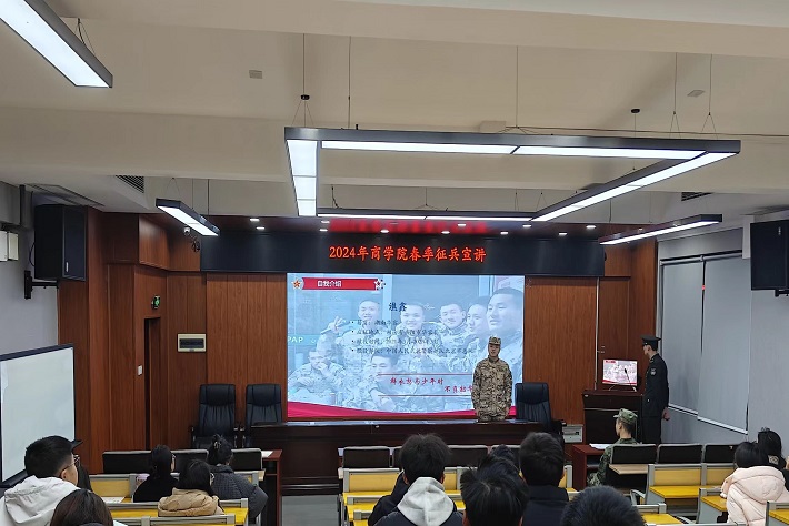 2024年12月26日晚,经济管理学院在博文楼南1205报告厅举办2024年春季征兵宣讲会,我院2022级市场营销专业同学、退役大学生士兵谯鑫主讲。