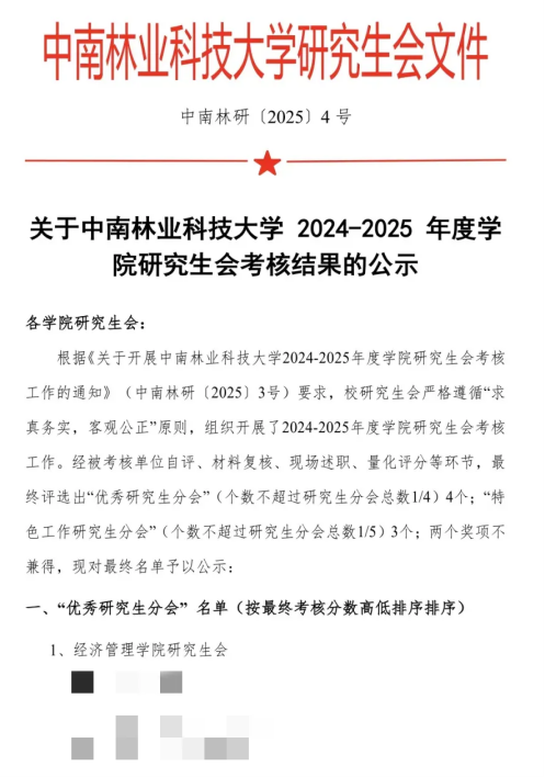 2025年9月15日,中南林业科技大学经济管理学院研究生会凭借扎实的工作成果、突出的综合表现,在全校二级学院研究生会考评中,以总分第一名的优异成绩脱颖而出,获评2024-2025年度“优秀研究生分会”,这一荣誉是对学院研究生会辛勤耕耘的高度认可。